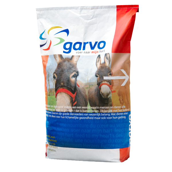 • Give unlimited straw and possibly some structural hay. • Complete the ration with 300 – 500 g 1035 alfamix donkey per day. • Give more 1035 alfamix donkey if it’s cold outside or they work. • Double the amount of 1035 alfamix donkey with highly pregnant or lactating donkeys. • Supplement for variation now and then sparsely, for example with carrot, apple or pre-soaked beet pulp, and then give at the next feeding perhaps somewhat less 1035 alfamix donkey, depending on the amount and nutritional value of the supplement. • Make sure there’s always fresh drinking water.