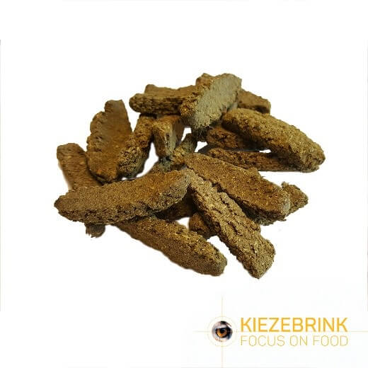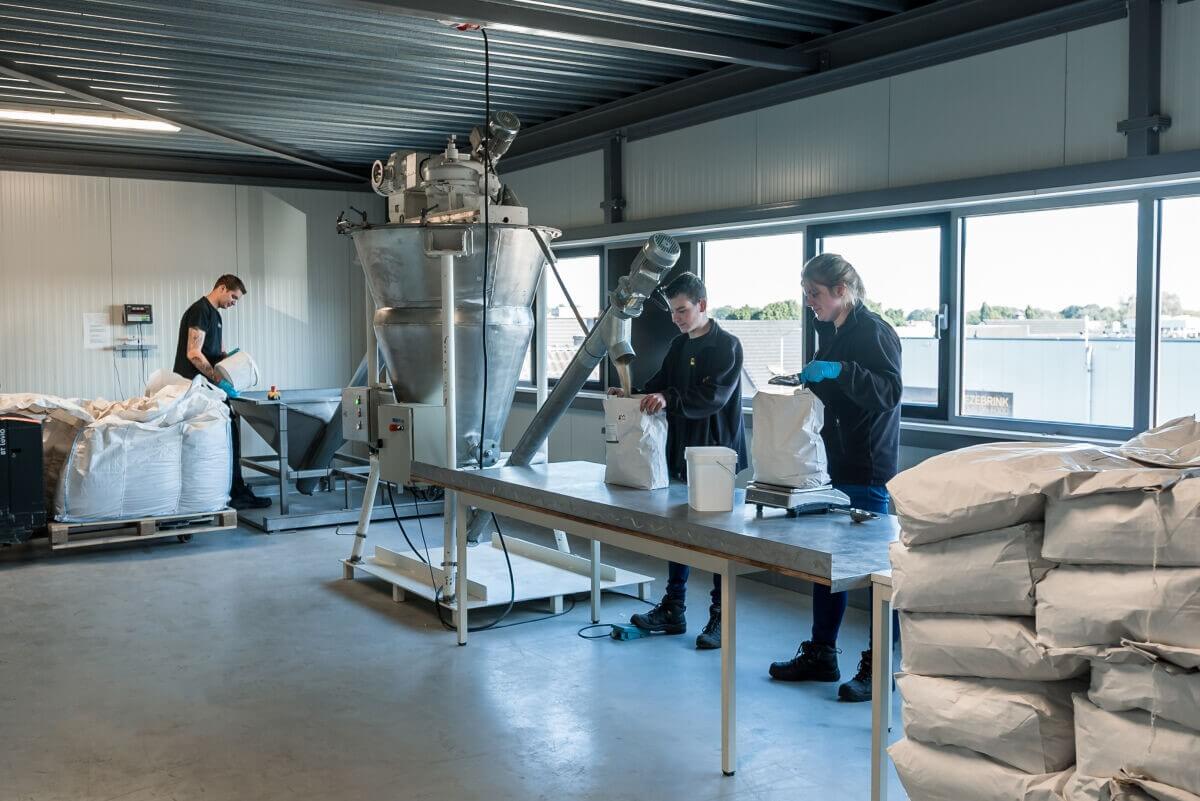 Als we besloten hebben wat de beste vorm is voor het product moeten we een producent vinden die dit voor ons kan maken. We hebben twee vaste fabrikanten voor de productie van onze producten. Zo kunnen we zowel geperste als geëxtrudeerde pellets laten maken, met of zonder dierlijk eiwit. Samen met de nutritionisten van deze bedrijven beslissen we wat de definitieve samenstelling wordt van het product en laten we een testbatch maken. Niet alle diervoederfabrikanten mogen dierlijk eiwit verwerken. Daarom zijn we recent gestart een eigen productielocatie bij Kiezebrink. Hier kunnen we poeders mixen die dierlijk eiwit bevatten. Dit geeft ons de kans om producten in poedervorm te produceren en om kleine testbatches van nieuwe producten te maken.