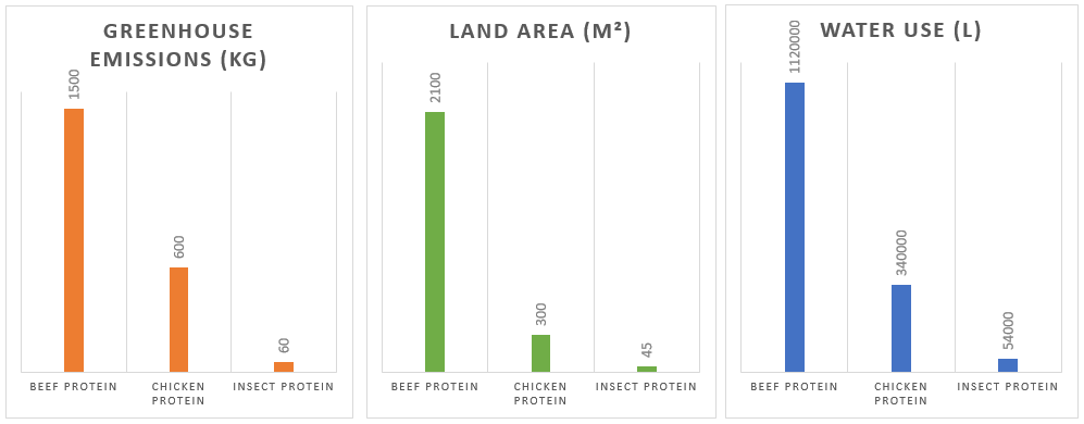 Bronnen die nodig zijn voor de productie van 10 kg eiwit van verschillende eiwitbronnen (Protix, 2019)