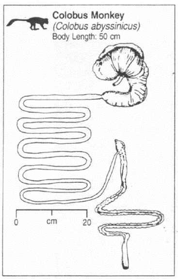 Afbeelding van het verteringsstelsel van de colobus aap (Stevens 1995).